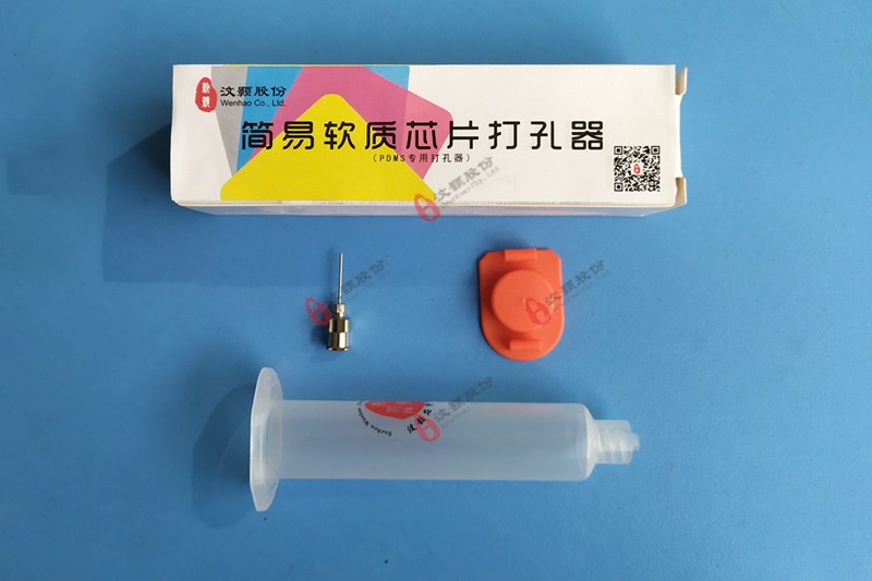 PDMS芯片簡易打孔器是我司自主開發的簡易PDMS芯片加工工具,由中空針頭、手握管體、頂端堵頭等三部分組成。其中中空針頭經過機械倒角打磨處理,非常鋒利,該結構類型決定了其PDMS芯片孔徑與針頭內經一致。